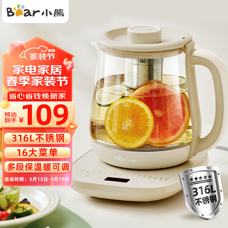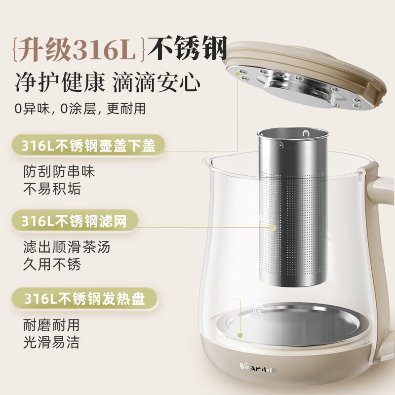 小熊(Bear)养生壶 煮茶器 烧水壶 煮茶壶 316L不锈钢多段保温迷你玻璃花茶壶 电热水壶1.5L YSH-E15Q7带滤网价格:109.00元!