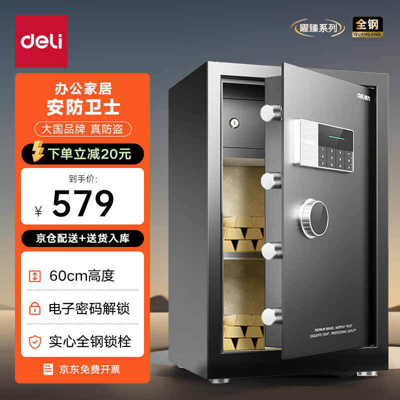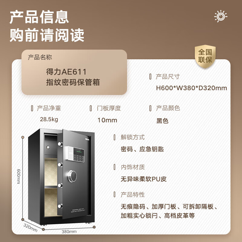 得力保险柜 家用电子密码保险箱办公小型保密箱全钢防盗可入墙入柜保险箱保管柜 曜臻AE611高60cm价格:599.00元!