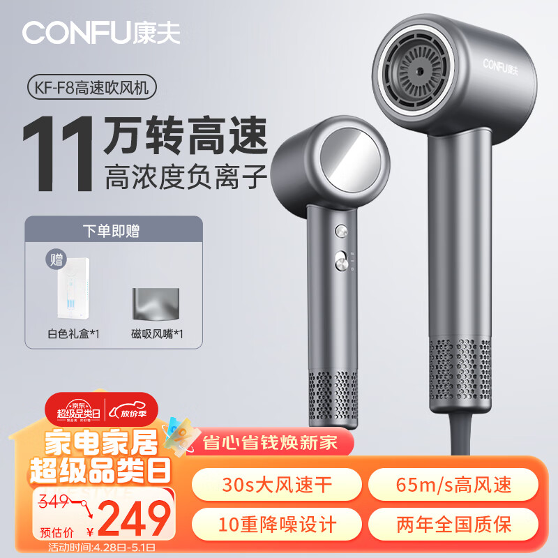 康夫(CONFU)11万转高速电吹风机家用速干大风力负离子护发送女友生日礼物吹风筒 KF-F8灰价格:399.00元!