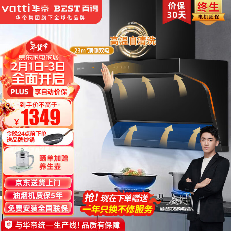 百得(BEST)华帝出品 顶侧双吸油烟机 家用7字型抽油烟机脱排23立方大吸力挥手感应自动洗 CXW-280-E600价格:1349.00元!