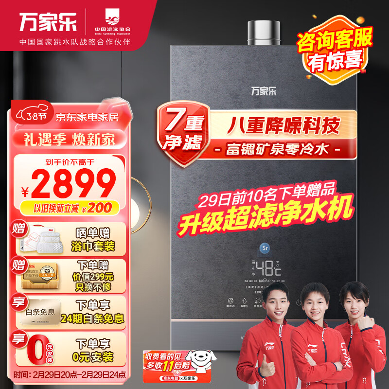 万家乐18升零冷水燃气热水器水伺服恒富锶矿泉瀑布洗降噪天然气家用双效增压JSQ34-18RL9价格:2999.00元!