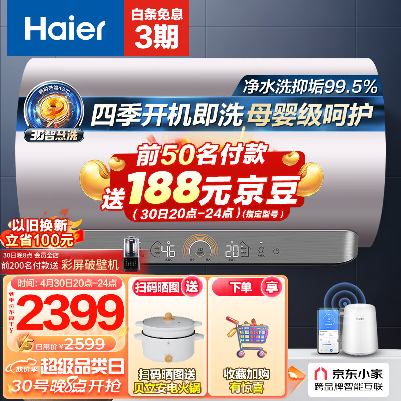 海尔(Haier)60升电热水器3300W变频 新3D智慧洗七净水洗 内胆免清洗AI智能 EC6005-JE5U1 京东小家智能价格:2599.00元!