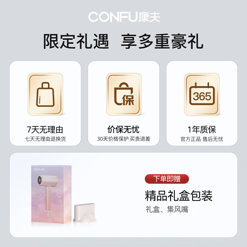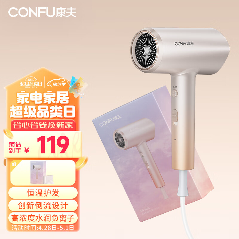 康夫(CONFU)电吹风机大功率1800W速干负离子护发宿舍家用生日礼物送女友吹风筒 KF-3157香槟金价格:149.00元!