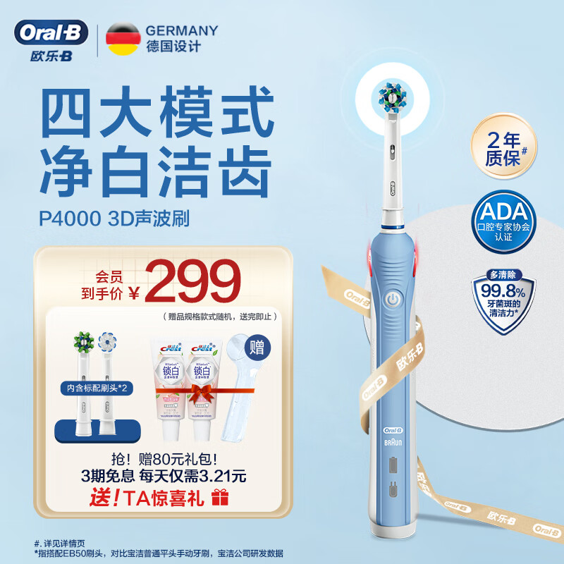 欧乐B成人电动牙刷P4000深度清洁牙龈按摩3D声波P系列圆头送男友送女友情侣礼赠生日礼物价格:289.00元!