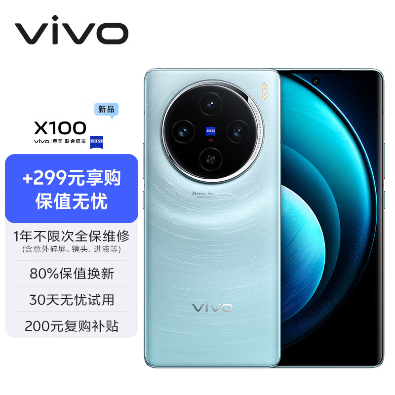 vivo X100 12GB+256GB 星迹蓝【保值无忧套装】蓝晶×天玑9300 5000mAh蓝海电池 蔡司超级长焦 5G 拍照 手机价格:4298.00元!