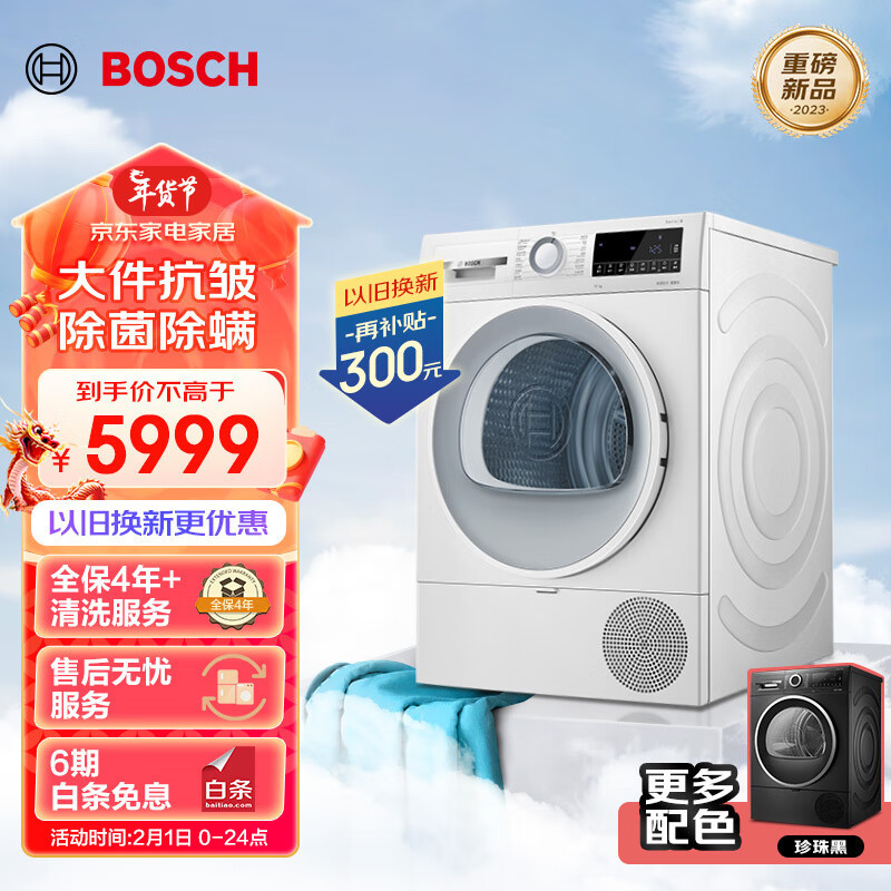 博世(BOSCH)烘干机家用【云朵白主推品】10公斤大容量热泵干衣机除菌螨祛病毒 12档精烘智控烘干 WQE252U0AW价格:6599.00元!