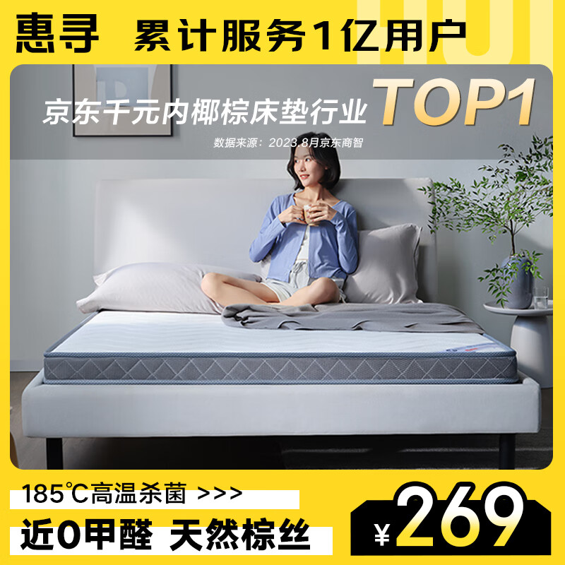 惠寻 京东自有品牌 椰棕床垫硬棕垫薄床垫偏硬无胶水0.9*1.9米10cm厚价格:269.00元!