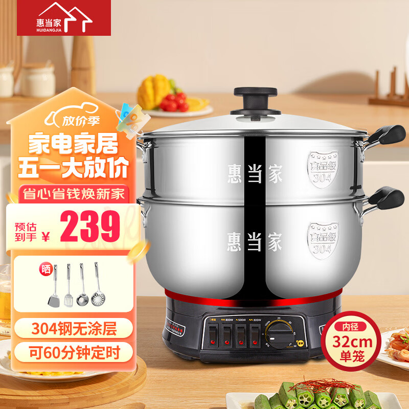 惠当家(Hui Dang Jia)电锅多功能电热锅定时电煮蒸锅电炒锅多用途锅电火锅304不锈钢锅 32cm单笼【定时款】 5L价格:239.00元!