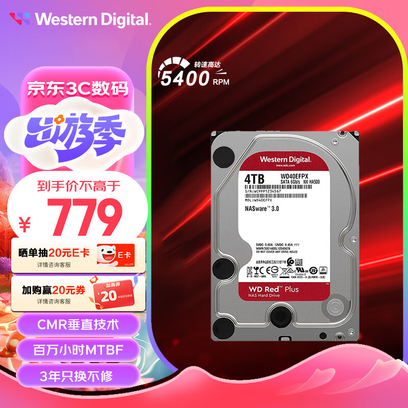 西部数据 NAS硬盘 WD Red Plus 西数红盘Plus 4TB CMR 5400转 256MB SATA 网络存储 私有云常备(WD40EFPX)价格:779.00元!