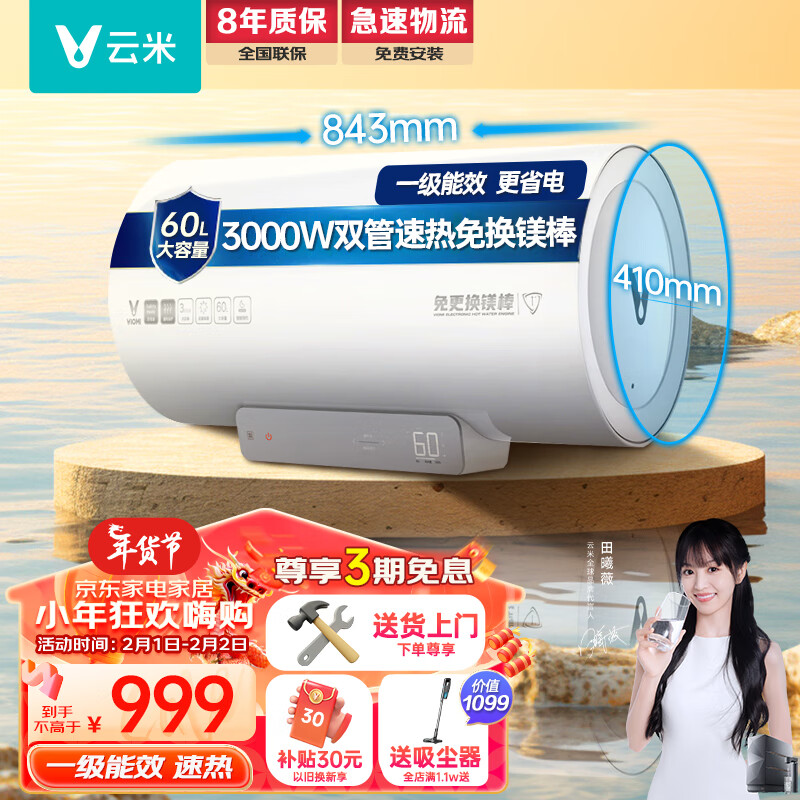 云米(VIOMI)电热水器3000W免换镁棒双管电热水器60升家用APP智控 一级能效VEW6010【速热健康洗】价格:999.00元!