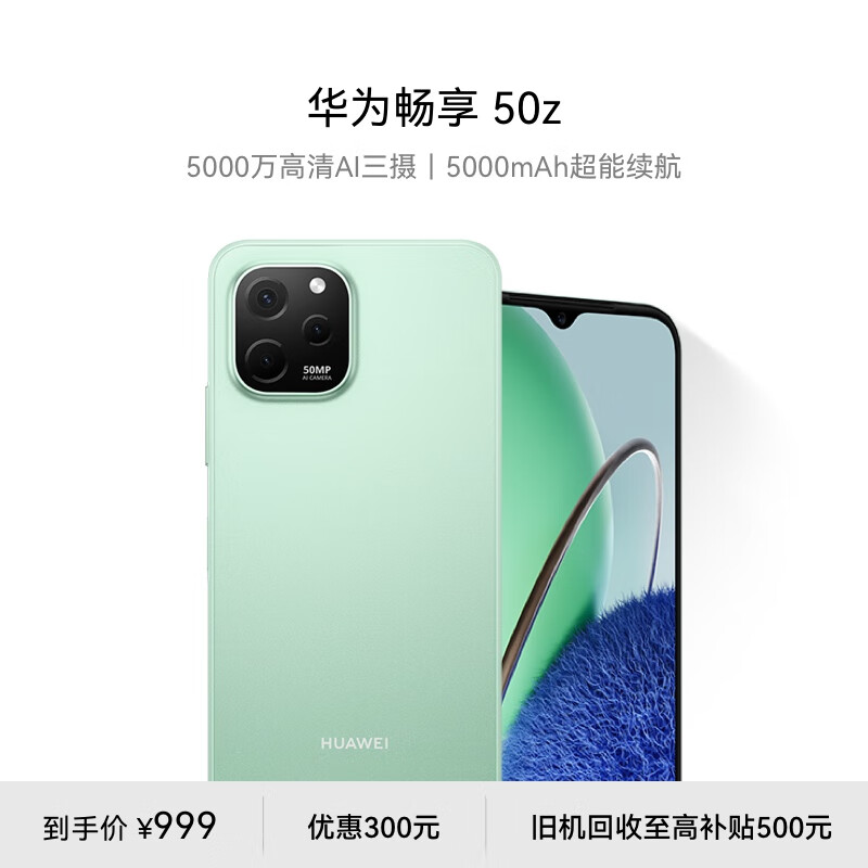 华为畅享 50z 5000万高清AI三摄 5000mAh超能续航 8G+128GB 薄荷绿 大内存鸿蒙智能手机价格:999.00元!