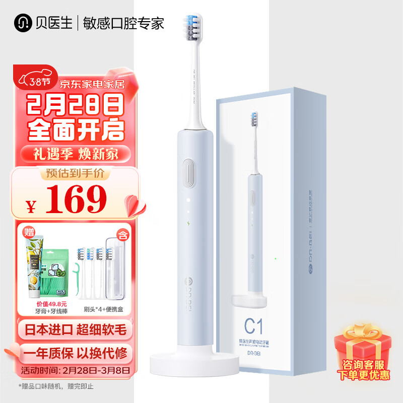 贝医生(DR·BEI)电动牙刷 C1便携旅行洗漱套装国产 超细软毛轻巧便携款 情侣牙刷 成人净齿护龈 新年礼物 声波牙刷 静谧蓝【清洁1+敏感3+旅行盒】价格:219.00元!