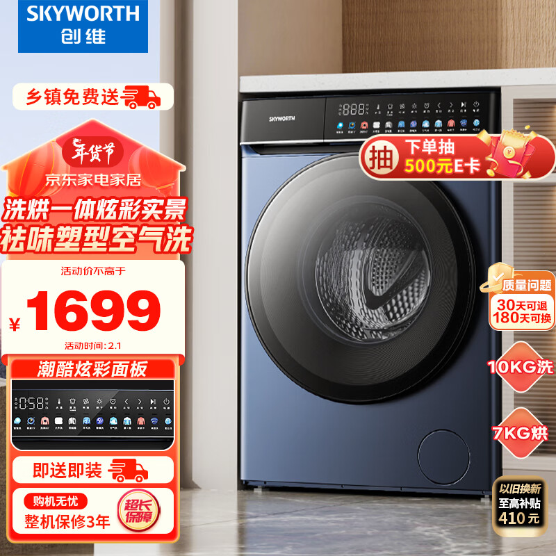 创维(SKYWORTH)10公斤变频滚筒洗衣机全自动 洗烘一体 除螨 炫彩触控 家用大容量 XQG100-B63RBH价格:1699.00元!