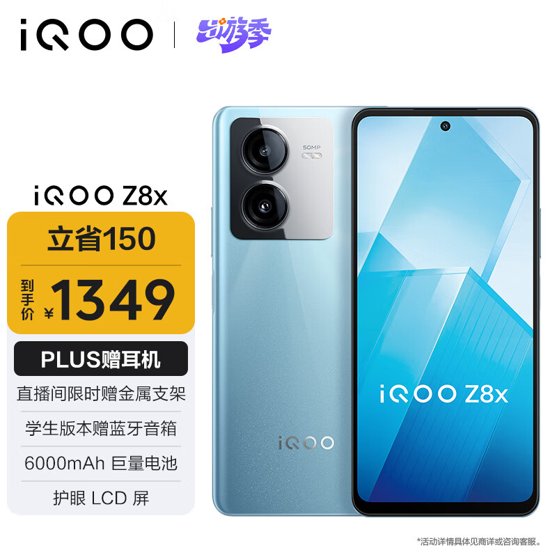vivo iQOO Z8x 12GB+256GB 星野青 6000mAh巨量电池 骁龙6Gen1 护眼LCD屏 大内存5G电竞手机价格:1499.00元!