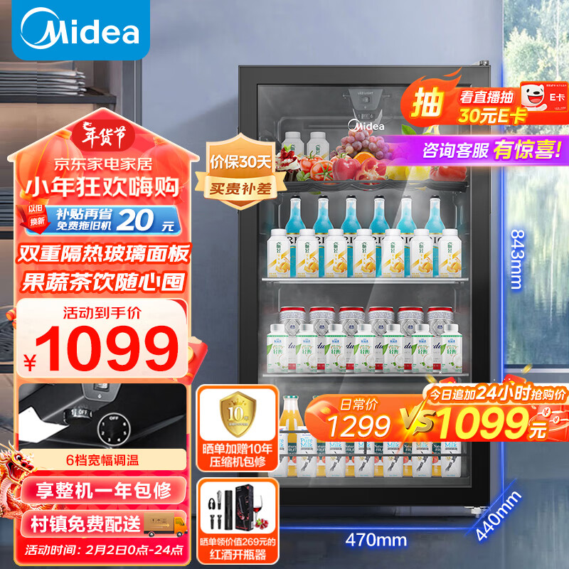 美的(Midea)95升家用客厅办公室冷藏柜暖藏冰吧 茶叶饮料水果蔬菜保鲜柜囤货小型冰箱JC-98GM(E) 以旧换新价格:1199.00元!