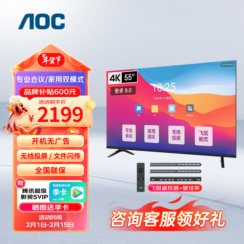 AOC会议电视4K超清会议平板一体机移动电视会议室显示屏投影投屏商用电视多媒体一体机智能显示智慧屏55英寸55NV+壁挂架+桌面支架底座价格:2199.00元!