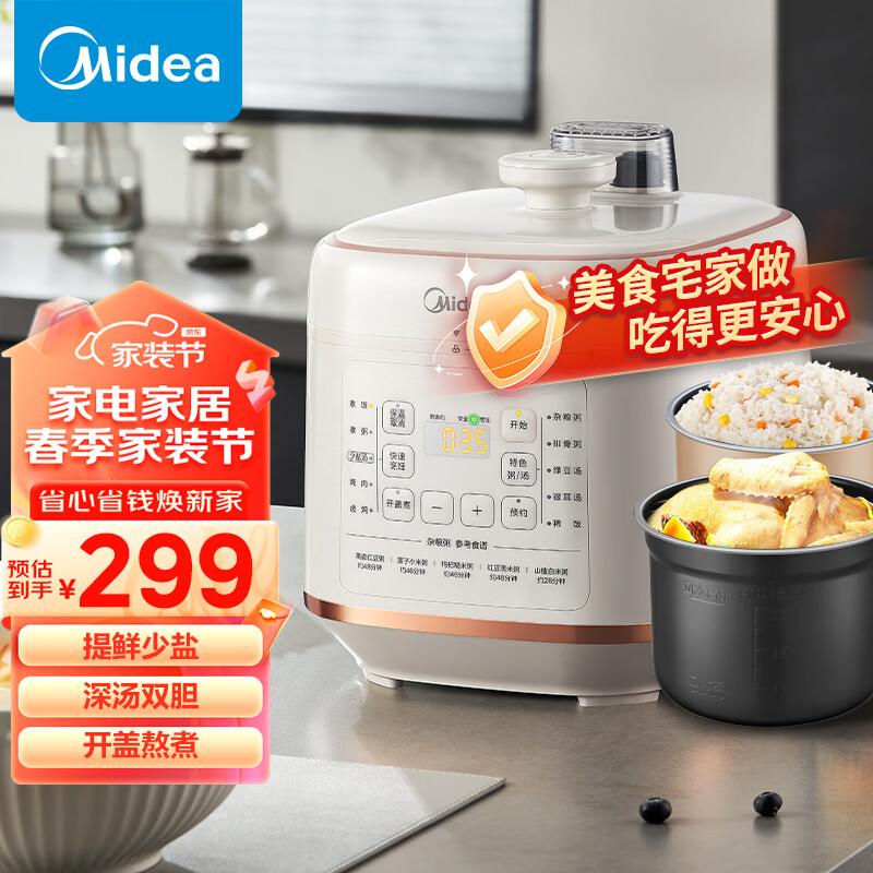 美的(Midea)提鲜系列电锅 5L全自动家用智能预约 上蒸下煮 不粘双胆煲汤炖肉电饭煲高压锅2-6人MY-C548价格:299.00元!