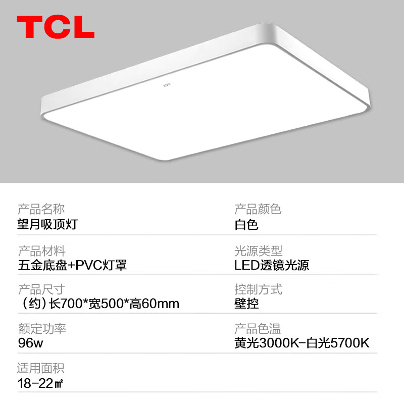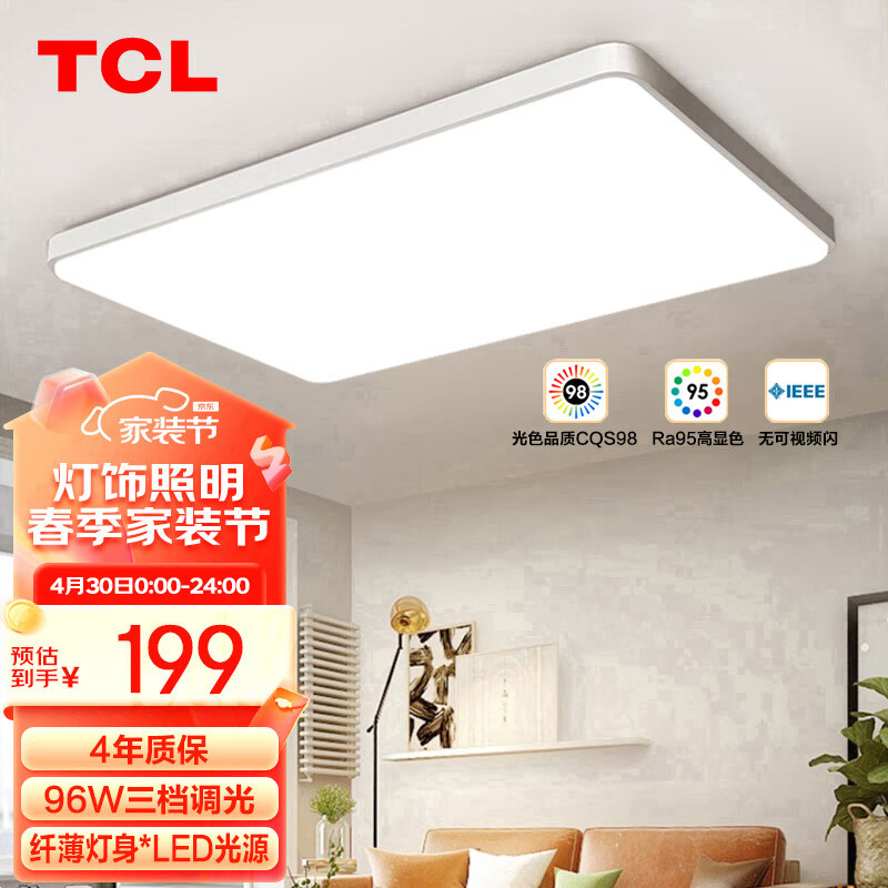 TCL客厅灯吸顶灯大厅led天花板大灯主灯96w三色调光超薄灯饰灯具价格:199.00元!