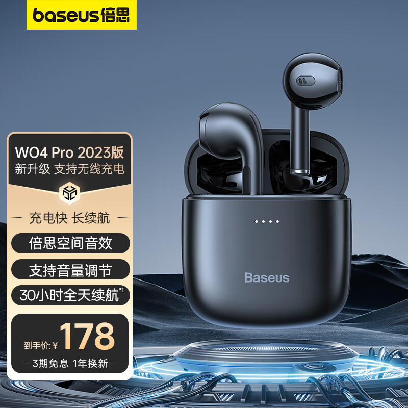 倍思W04 Pro 2023版 蓝牙耳机真无线半入耳运动低延迟长续航适用于苹果华为小米oppo荣耀手机 黑色价格:188.00元!