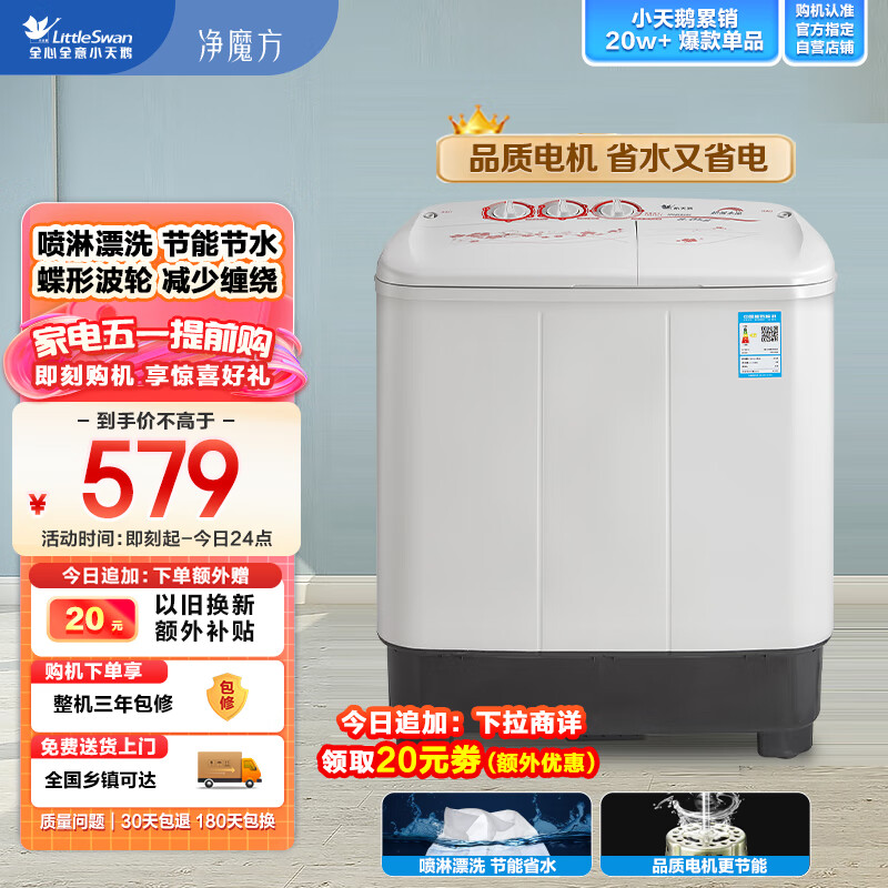 小天鹅(LittleSwan)双桶双缸洗衣机半自动 8公斤家电 喷淋漂洗强力去污 以旧换新 操作简便 租房家用 TP80VDS08价格:579.00元!