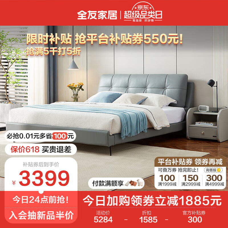 全友家居 真皮艺双人床1.8x2米现代简约主卧室头层牛皮软包大床105135价格:5284.29元!