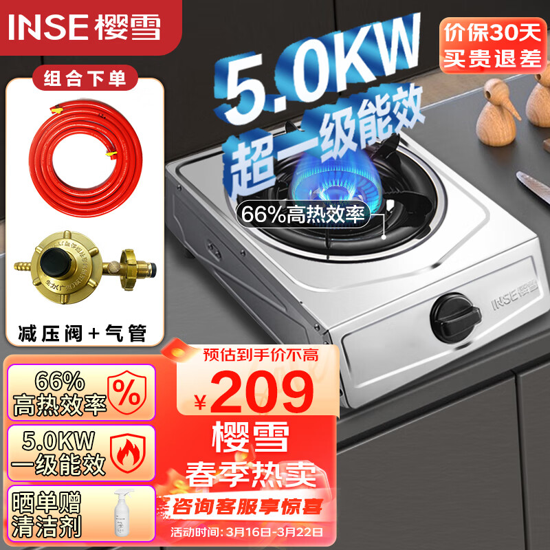 樱雪(INSE)燃气灶单灶 66%热效率 台式煤气灶单灶 5.0KW猛火单眼灶具 2331液化气+减压阀+软管价格:209.00元!
