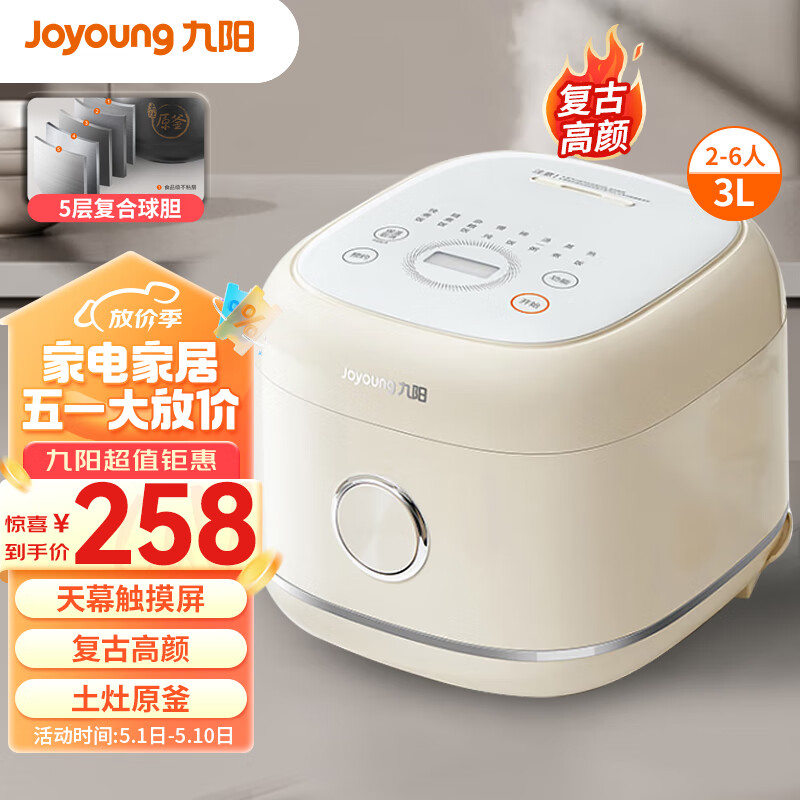 九阳(Joyoung)3升2-6人电饭煲电饭锅球形铝胆受热更均匀750W火力加热8大功能菜单3L漫生活系列F-30FY2价格:258.00元!