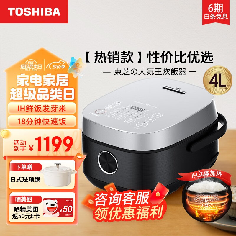 东芝(TOSHIBA)电饭煲家用4升发芽米多功能电饭锅 2-6人家用煮饭锅 进口不粘涂层鲜饭煲 黑色4L【性价比优选】15HNC(K) 4L价格:1199.00元!