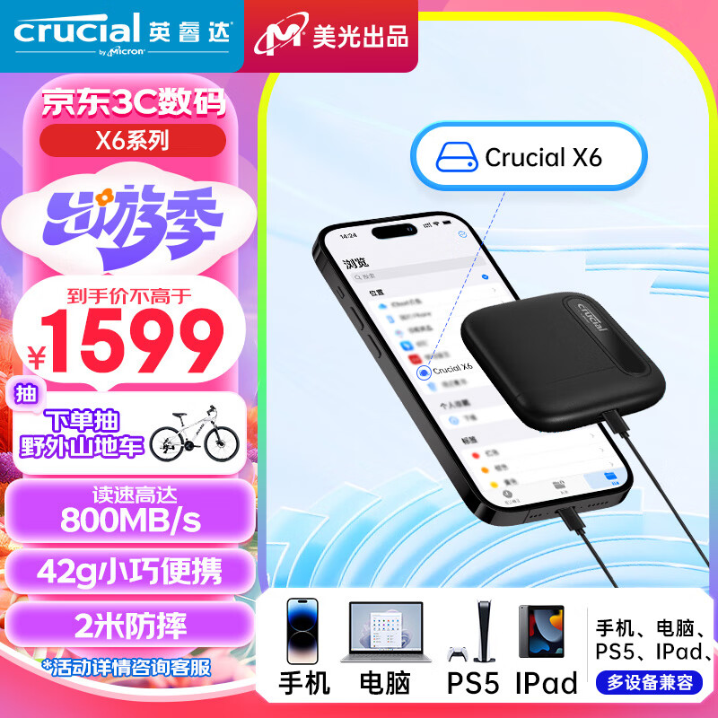 Crucial英睿达 美光 4TB Type-c USB3.2 移动固态硬盘(PSSD)X6系列 SSD 800MB/s高速 笔记本手机直连SSD价格:1599.00元!