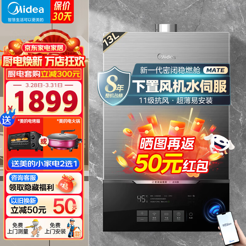 美的(Midea)13升燃气热水器下置风机天然气智控增压水伺服恒温新一代密闭稳燃舱高楼层适用以旧换新JSQ25-MATE价格:1899.00元!