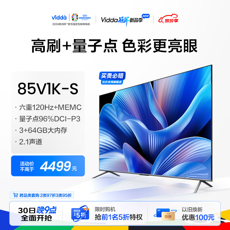 Vidda 海信电视 85V1K-S 85英寸 120Hz高刷 3+64G 游戏电视 4K超高清 超薄屏 智能巨幕电视以旧换新价格:4499.00元!