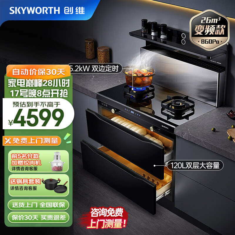 创维(Skyworth)集成灶一体灶 26立方大吸力变频节能 家用抽油烟机燃气灶保洁柜烟灶套装天然气JJZT-J72B价格:4599.00元!