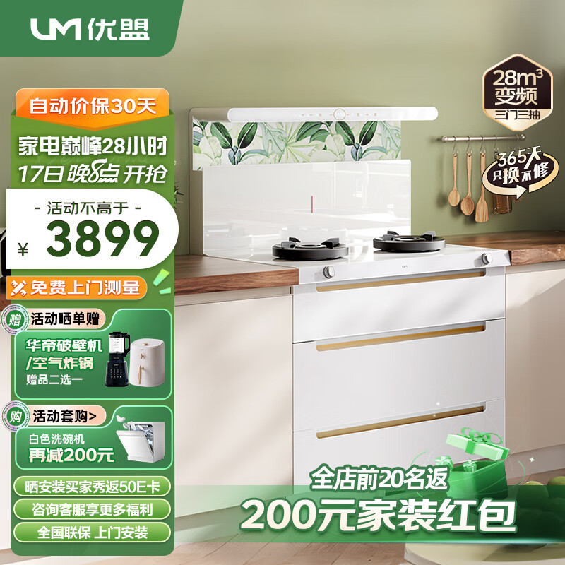 优盟(UM)集成灶一体式 家用变频大吸力白色集成灶一体灶 侧吸式油烟机燃气灶保洁柜套装自动清洗 天然气价格:3999.00元!