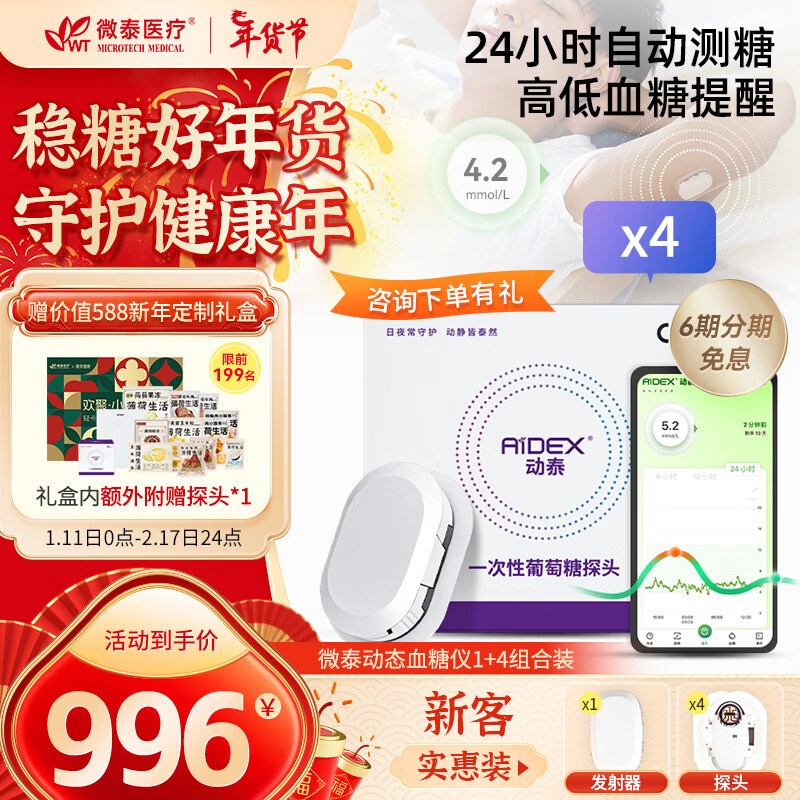 微泰动泰 动态血糖仪家用免采血24 小时动态血糖测试仪免扫描免校准(发射器*1+传感器探头*4)价格:2118.00元!