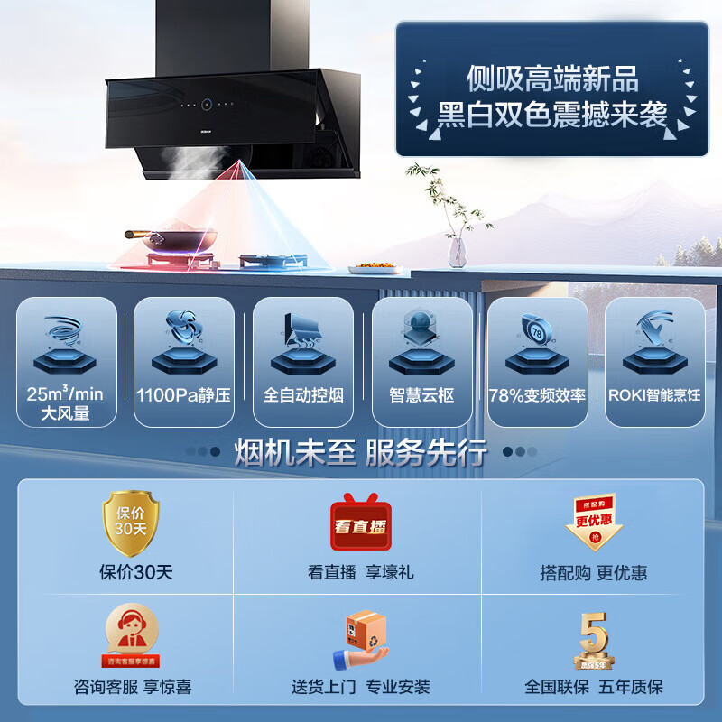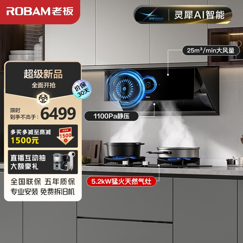 老板(Robam)【灵犀烟灶联动升级】侧吸油烟机25风量变频抽油烟机家用燃气灶具烟灶套装29X8S+57B6D(天然气)价格:6499.00元!