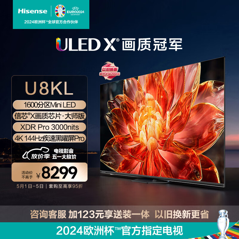 海信电视65U8KL 65英寸 ULED X 旗舰Mini LED 1600分区 3000nits 黑曜屏 PRO 液晶智能电视机 以旧换新价格:8299.00元!