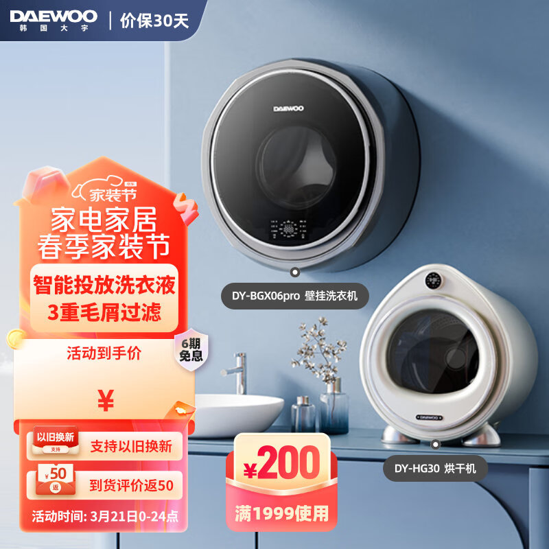 大宇(DAEWOO)3KG壁挂洗衣机+3KG台式烘干机 魔烘师洗烘套装 DY-BGX06pro银+DY-HG30白价格:5999.00元!
