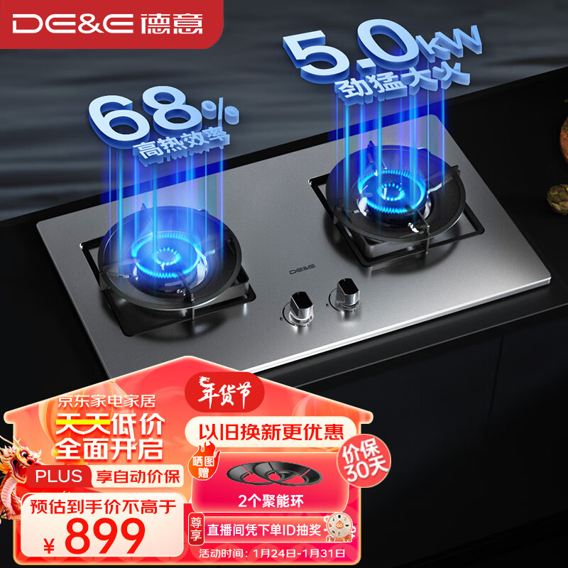 德意(DE&E)燃气灶 天然气 不锈钢 双眼灶具 5.0kW大火力 68%热效率 全尺寸适配嵌入式灶具JZT-716G价格:949.00元!