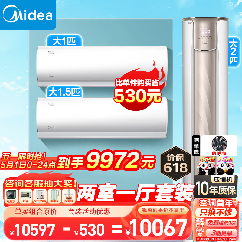 美的(Midea)空调套装两室一厅套餐一套购齐 新一级能效变频挂机柜机 2匹锐静+风酷/极酷/冷静星/酷省电/青春价格:9972.00元!