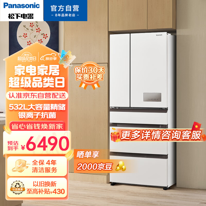 松下(Panasonic)532升家用大容量多门冰箱 银离子kang菌 变频无霜风冷NR-JE54WGC-W价格:7190.00元!