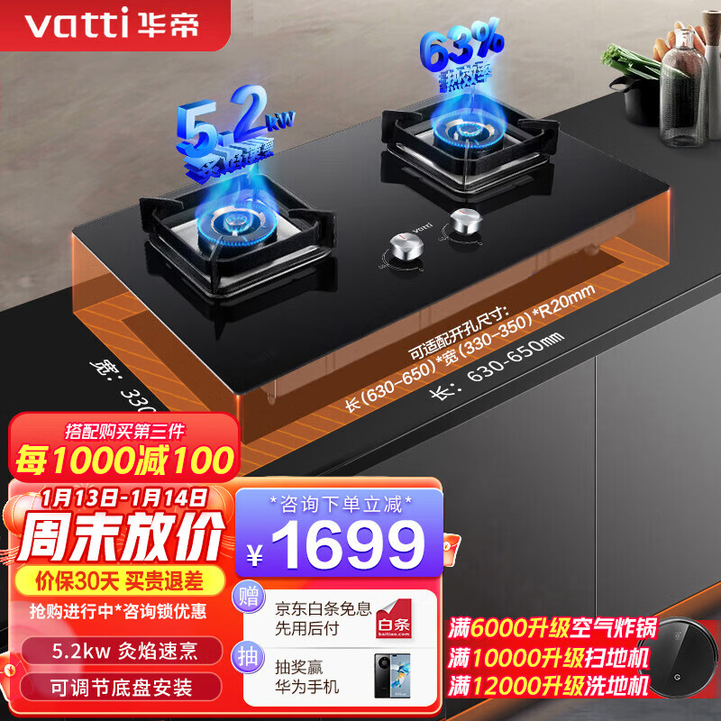 华帝(VATTI)i10089B燃气灶5.2kw超大火力灶具嵌入式台式双灶可调节安装尺寸灶钢化玻璃 燃气灶 液化气5.0kw价格:1699.00元!