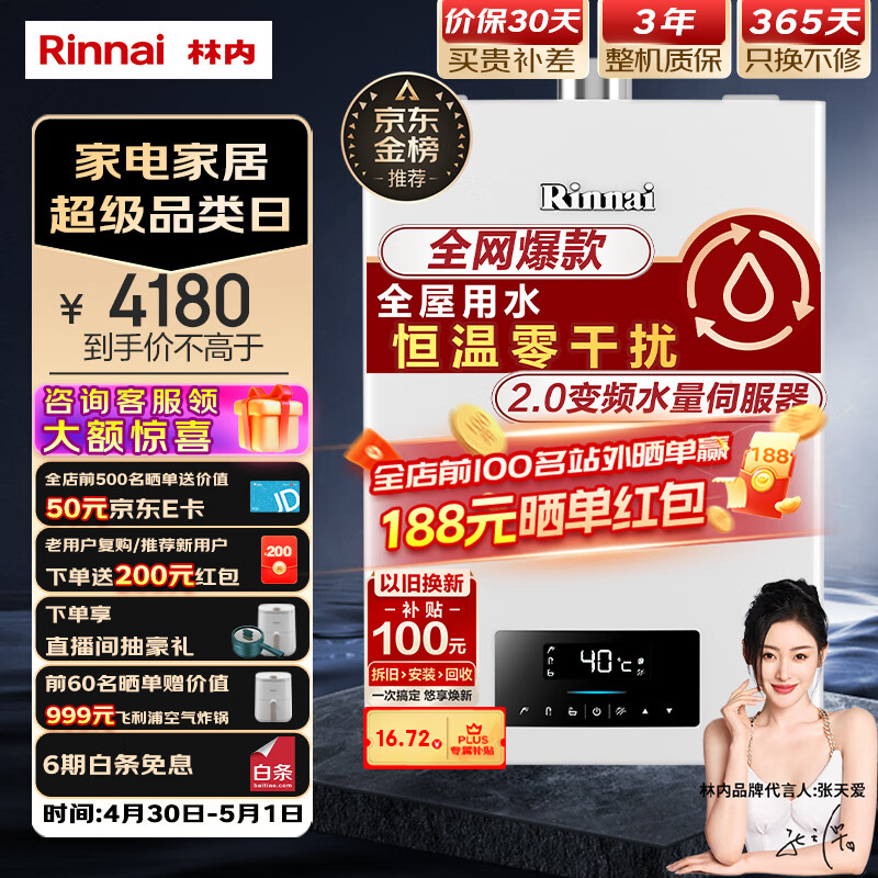 林内(Rinnai)16升 水量伺服器 防冻恒温 燃气热水器下置风机 天然气 RUS-16QC06 (JSQ31-C06)价格:4170.00元!