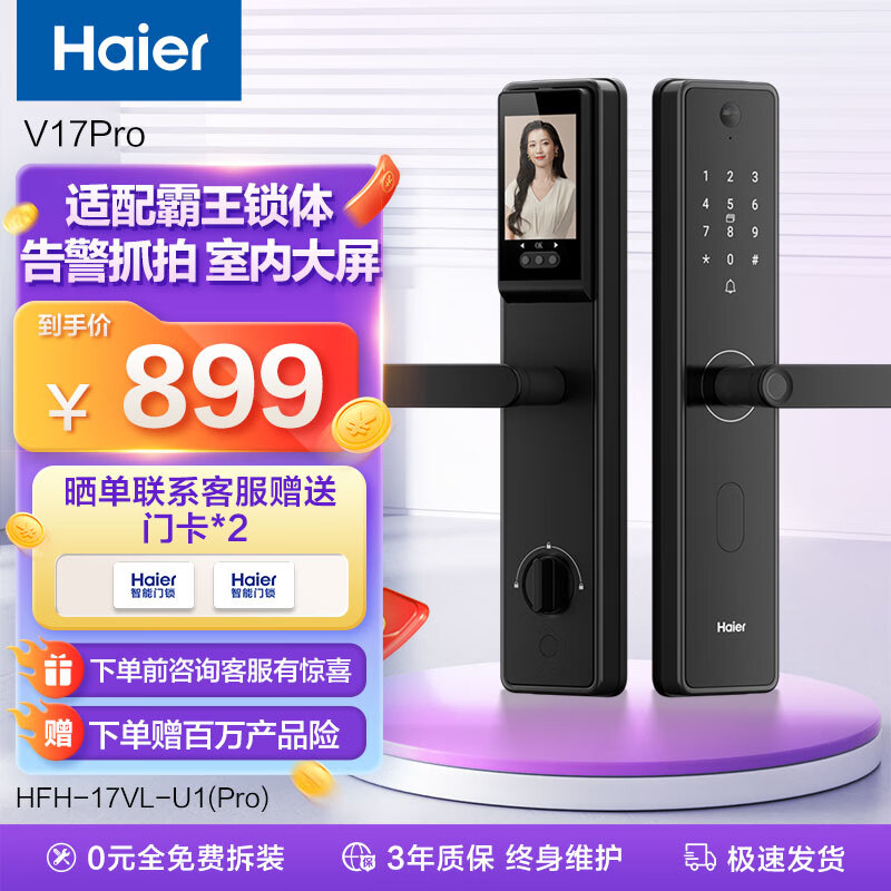 海尔 (Haier) 智能门锁 指纹锁 密码锁 家用防盗门智能联网 防盗门 入户门 木门 电子锁 V17Pro霸王锁(3.5英寸大屏+猫眼抓拍)价格:999.00元!
