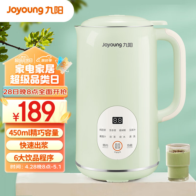 九阳豆浆机450ml精巧容量易收纳 快速出浆细腻研磨1-12H预约多功能料理机破壁机DJ04X-D126价格:184.00元!