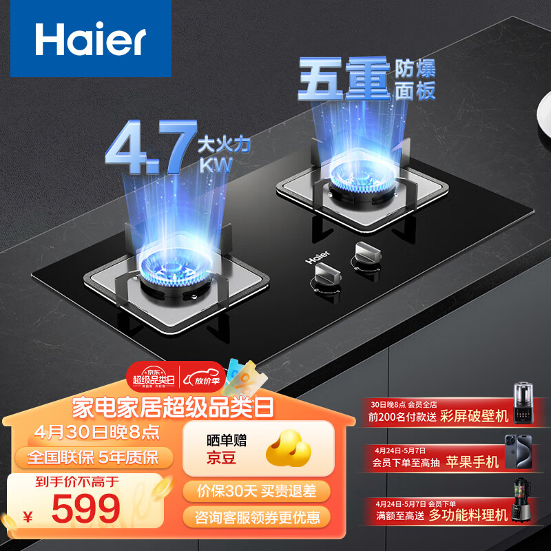 海尔(Haier)燃气灶天然气 嵌入式双灶具 4.7kw大火力 自动熄火保护 五重防护 台嵌两用一级能效Q2BE1(天)价格:699.00元!