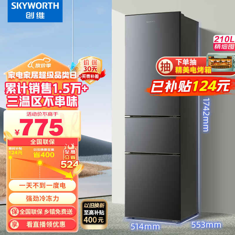 创维 (SKYWORTH)210升小冰箱 三门家用小型电冰箱 三门三温区中门软冷冻 保鲜省电低音P21TJ价格:775.00元!