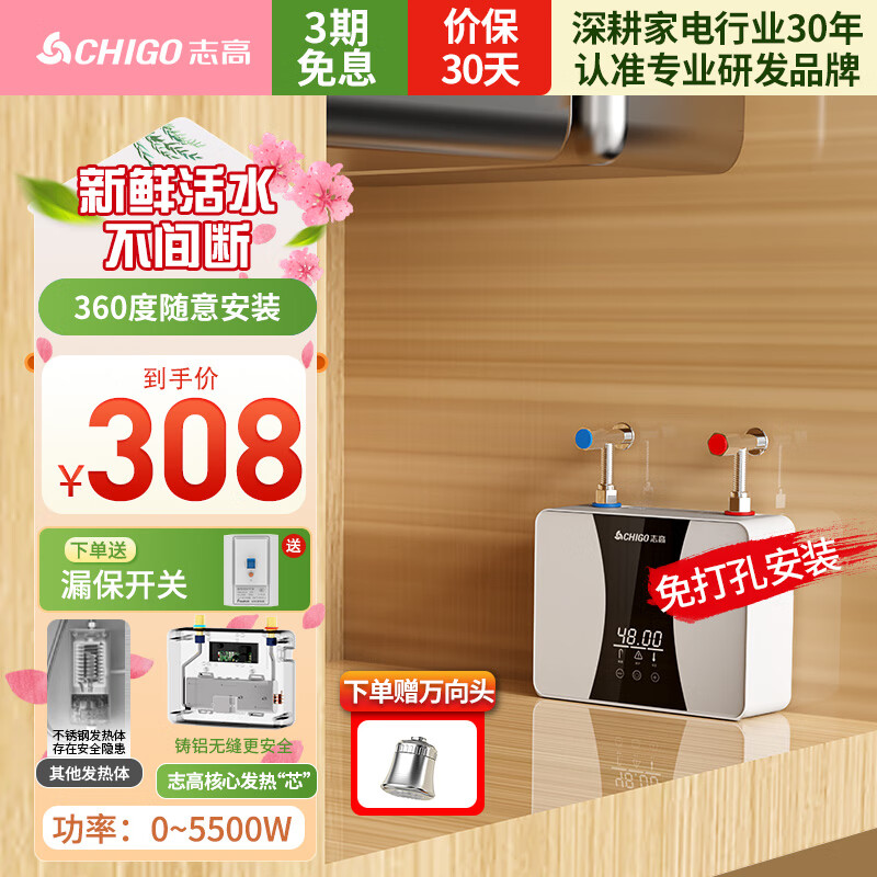 志高(CHIGO)即热式小厨宝5500W电热水器厨房热水器集成免储水水龙头加热器过水热可台上台下 送漏保ZG-KB519价格:308.00元!