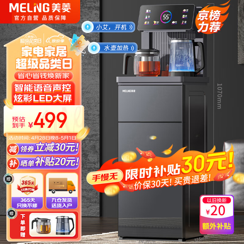 美菱(MeiLing)智能语音遥控茶吧机家用高端客厅立式饮水机下置桶大屏一键选温全自动冷热款MY-C912-B(语音款)价格:529.00元!