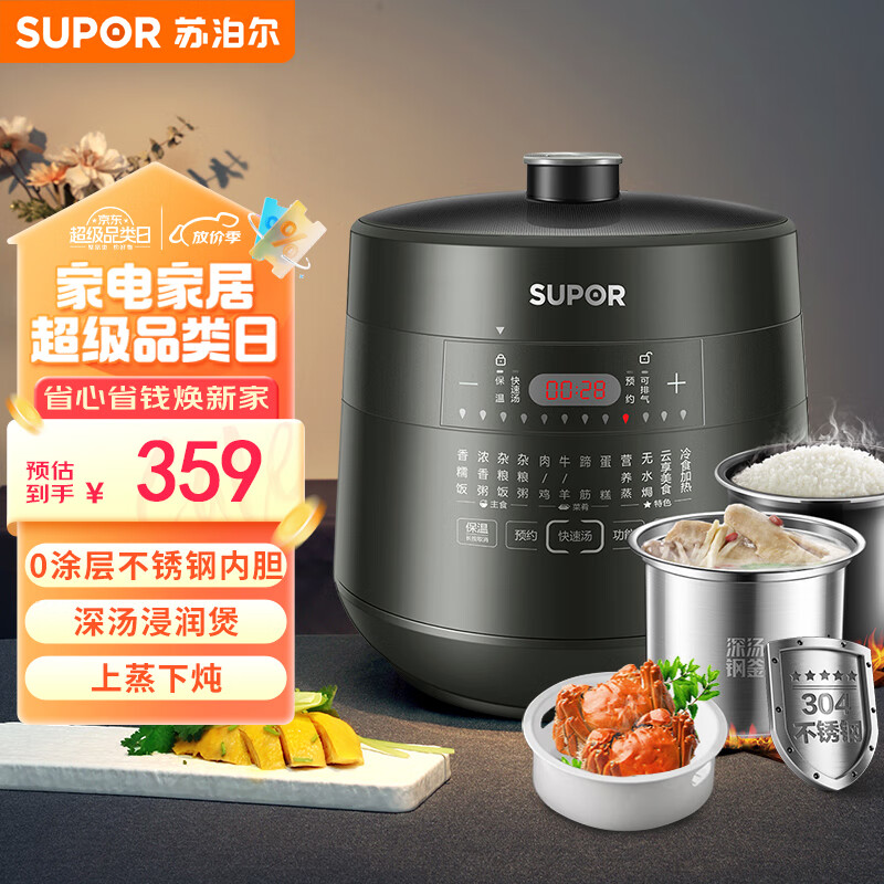 苏泊尔(SUPOR)深汤系列电锅5L 家用智能 上蒸下煮 0涂层钢胆大屏触控智能预约SY-50YC8082G双胆电饭煲高压锅价格:399.00元!