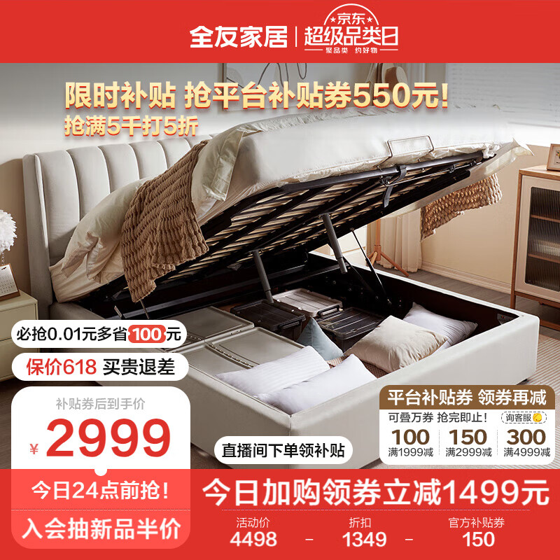 全友家居 床现代简约科技布床双人床卧室储物高箱床1.8米家具105207C价格:4498.57元!